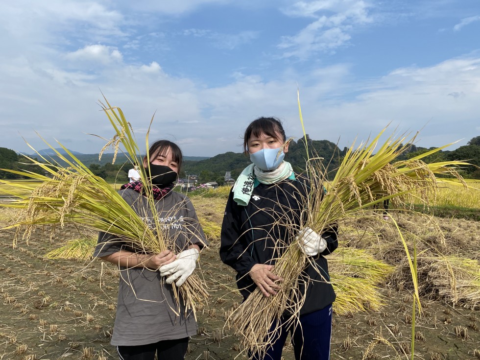 この体験は、今年は様々な活動が制限される中、学外で本物の史跡・文化的景観に直接触れながら景観や文化財を守る地域の人々との交流を図ることが目的です。史学・文化財学を専攻する約40名の学生さんが、慣れない稲刈りに汗を流しました。