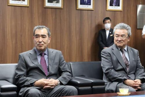 令和5年9月7日、「おおいたうつくし作戦功労者顕彰」を受賞した江畠一信さんと、ヤクルトヘルスフーズ株式会社の蝦名秀昭代表取締役社長と五ノ井良二取締役生産部長が、佐々木市長へ受賞報告を行いました。