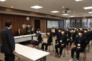 同部の中山田蒼汰主将から「レースでは序盤から全国の強豪校たちに引けを取らない積極的な走りをし、一時は3位に上がり、最終的には目標を超える7位という結果を勝ち取ることができました。この結果は応援や支援をしてくださった方々全員で勝ち取った結果だと思っています。この度は多大なる支援、本当にありがとうございました」と市長に報告しました。