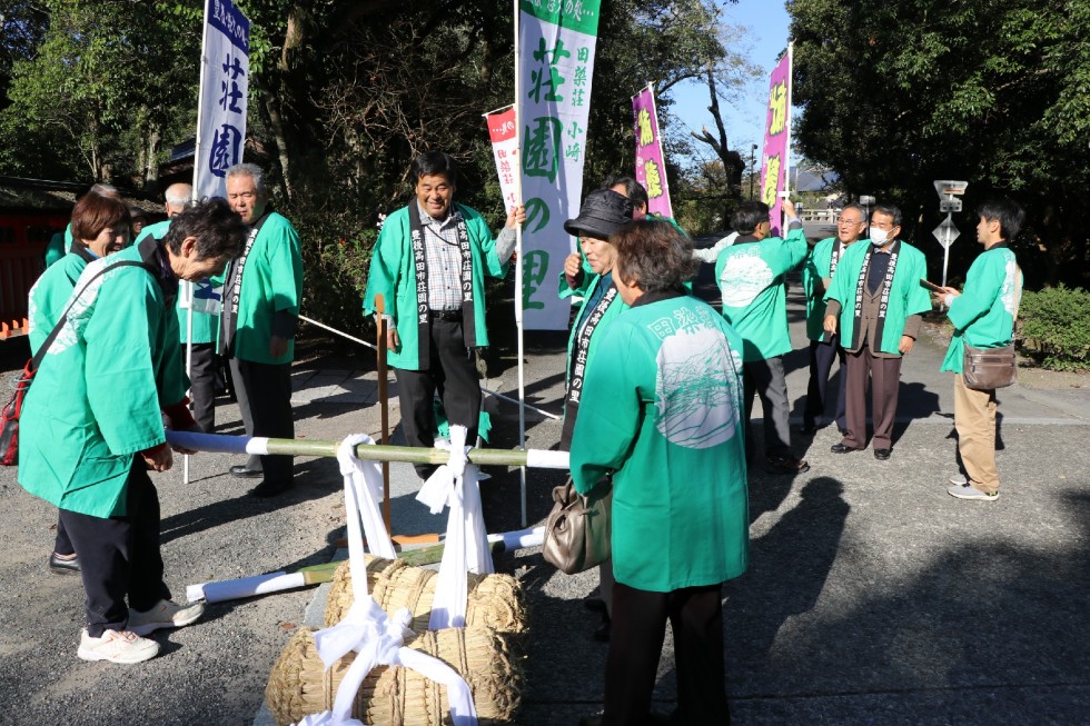 この日は、荘園の里推進委員会の皆さんなどが参加し、"荘園米"の新米を20kg米俵3つにおさめ、大鳥居前から本殿まで担いで奉納しました。