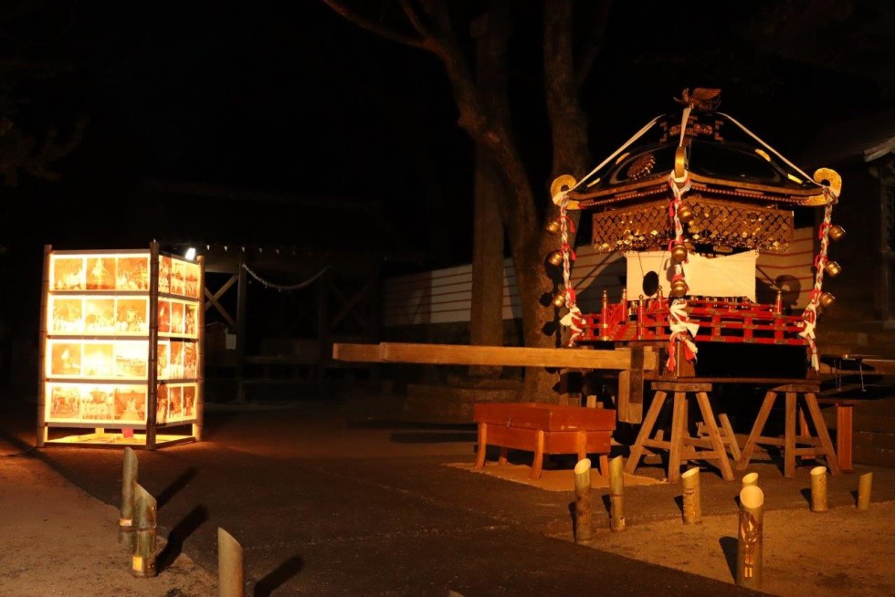 秋季大祭のお神輿も境内にライトアップされて飾られ、併せてお参りをする方も多くみられました。