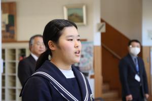 続いて、来賓として河野教育長や植田教育総務課長、河野学校教育課長からそれぞれ感謝とお礼のあいさつがあった後、全校生徒による校歌等の合唱があり、寄贈していただいたピアノの綺麗な音色と生徒の皆さんの美声がホールに響きわたっていました。