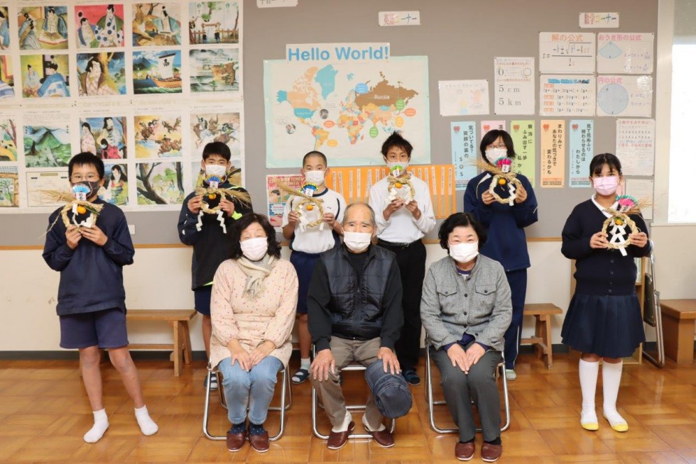 このしめ縄作りは、地域の方の協力により例年行っているもの(昨年は新型コロナの影響で中止)で、今年は5年生のお米づくりの授業で収穫した稲わらを材料に、5年生~7年生の子どもたちが挑戦しました。