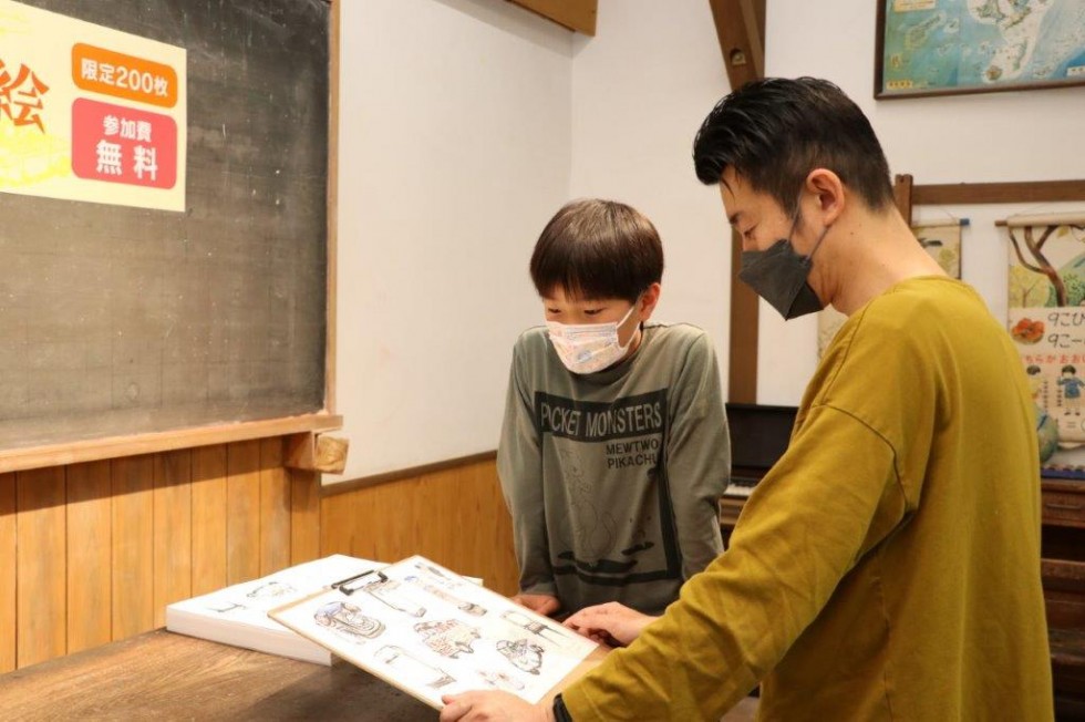 令和4年4月29日、ロマン蔵の昭和の町夢町小学校では、大分を拠点に全国で活躍するアーティスト北村直登さん制作の「昭和の町・オリジナルぬり絵」のワークショップが開催されました。