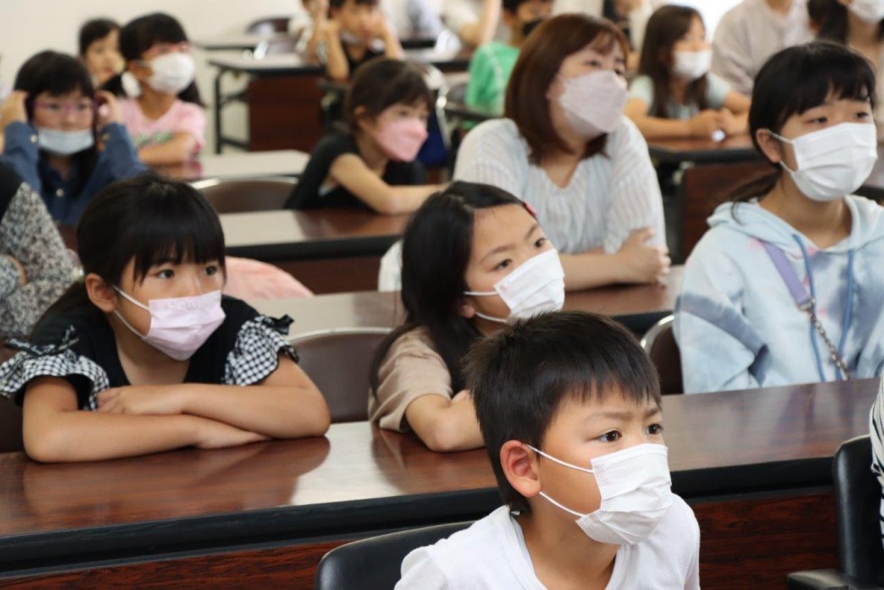 「災害の歴史と種類」について、市総務課防災対策室の担当職員から、スライドや動画を交えて説明を受けました。参加した子どもたちは、講義形式の中でも真剣な目で説明に聞き入っていました。