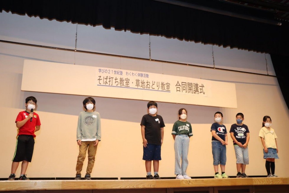 同館大ホールで行われた合同開講式には、そば打ち教室に4~6年生7人、草地おどり教室には1~3年生6人が参加しました。