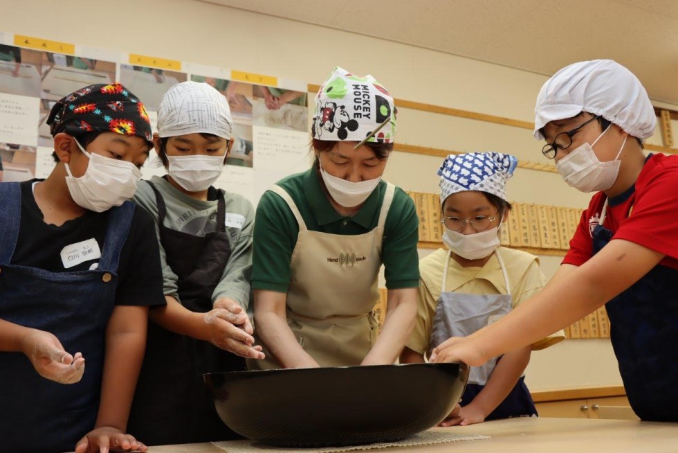 参加した子どもたちは、楽しみながらも真剣な面持ちでそば打ちに取り組み、「楽しかった。」「うまく打てるようになりたい。」と話してくれました。