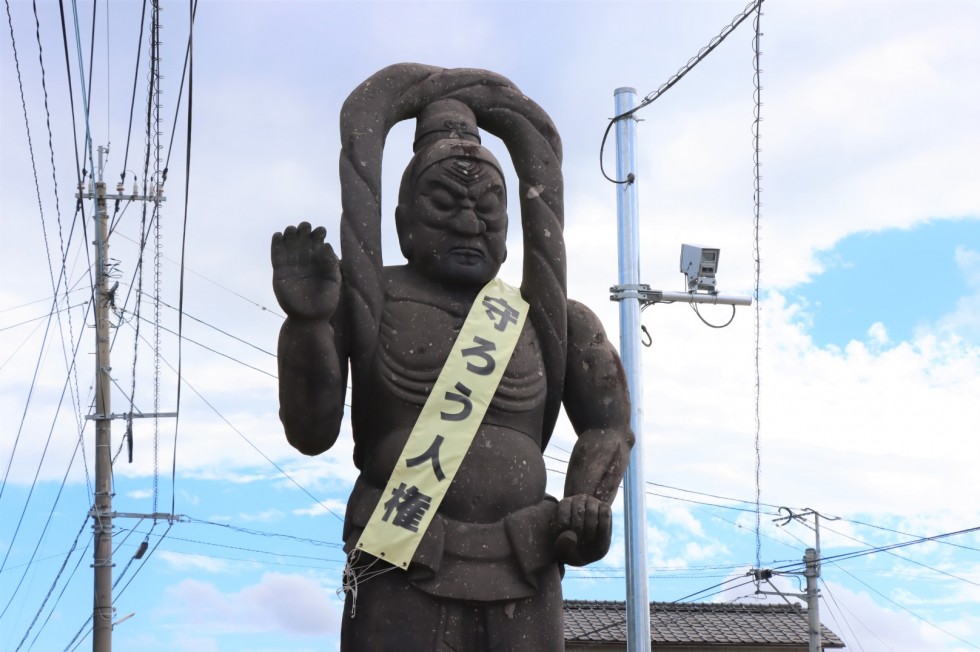 令和4年7月28日、市内6か所の仁王像に「なくそう差別」「守ろう人権」と表示したタスキがかけられました。