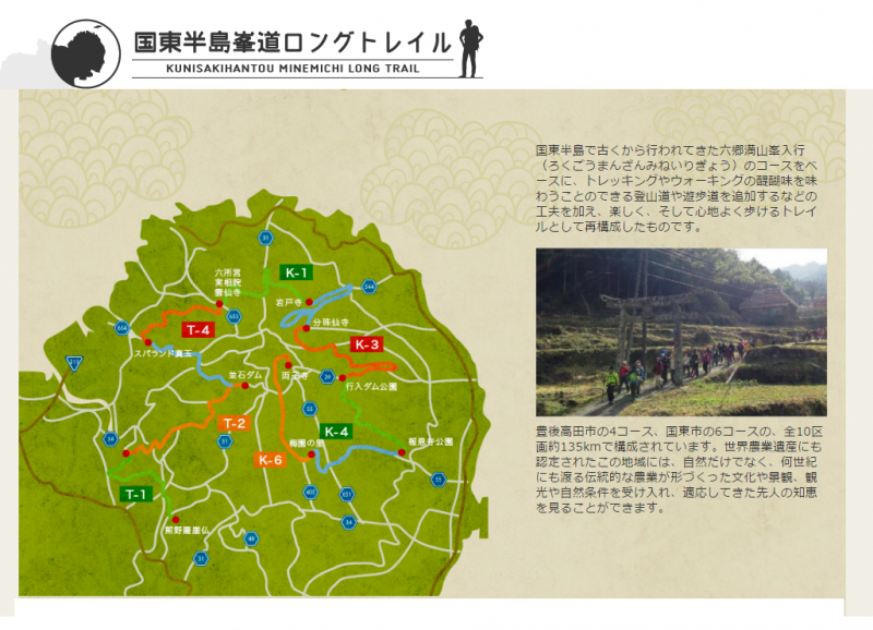 国東半島で古くから行われてきた六郷満山峯入行(ろくごうまんざんみねいりぎょう)のコースをベースに、トレッキングやウォーキングの醍醐味を味わうことのできる登山道や遊歩道を追加するなどの工夫を加え、楽しく、そして心地よく歩けるトレイルとして再構成したものです。