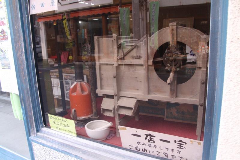 当時最も関係の深かった農業。昔の農機具を店頭に展示しています。